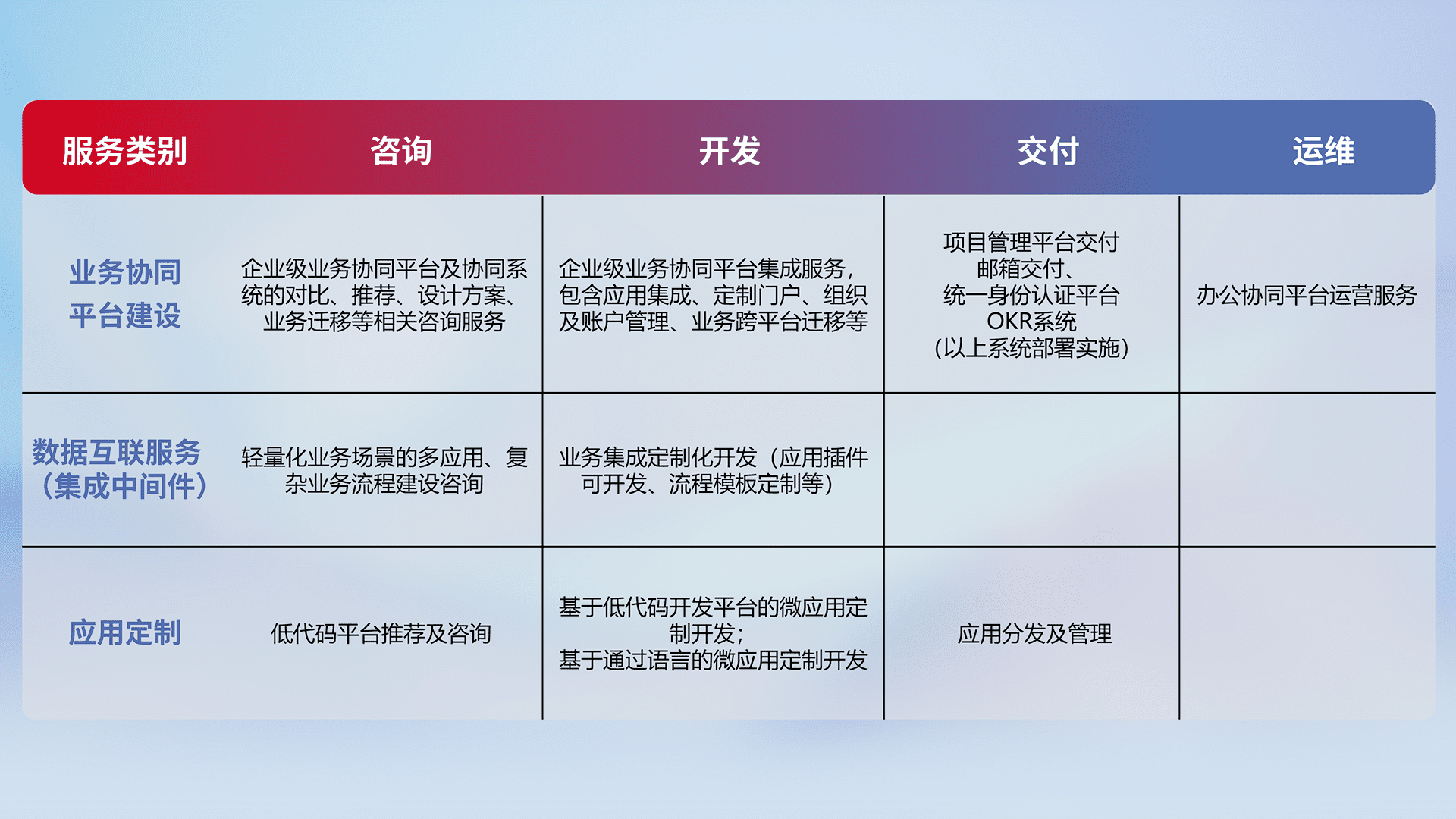 针对钉钉、、、、企微、、、、IDaas等平台级产品提供产品的规划、、、、方案、、、交付、、、、定制化开发等服务,,,,实现如统一协同办公、、、、智能客户服务、、混合会议管理、、、、智能数据查询、、等业务场景,,,实现数字化转型。。。。